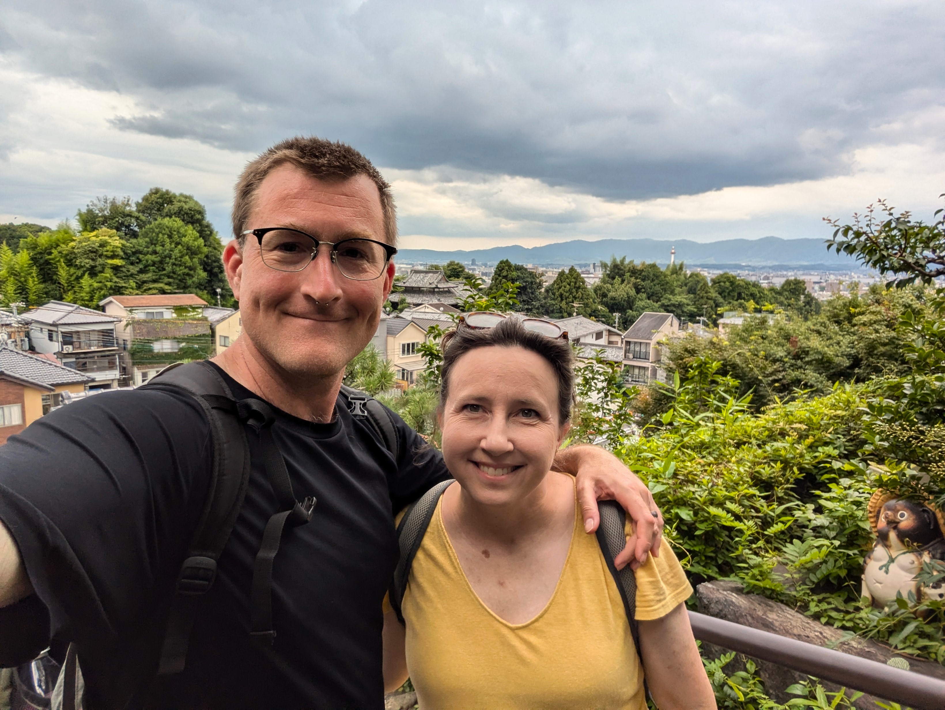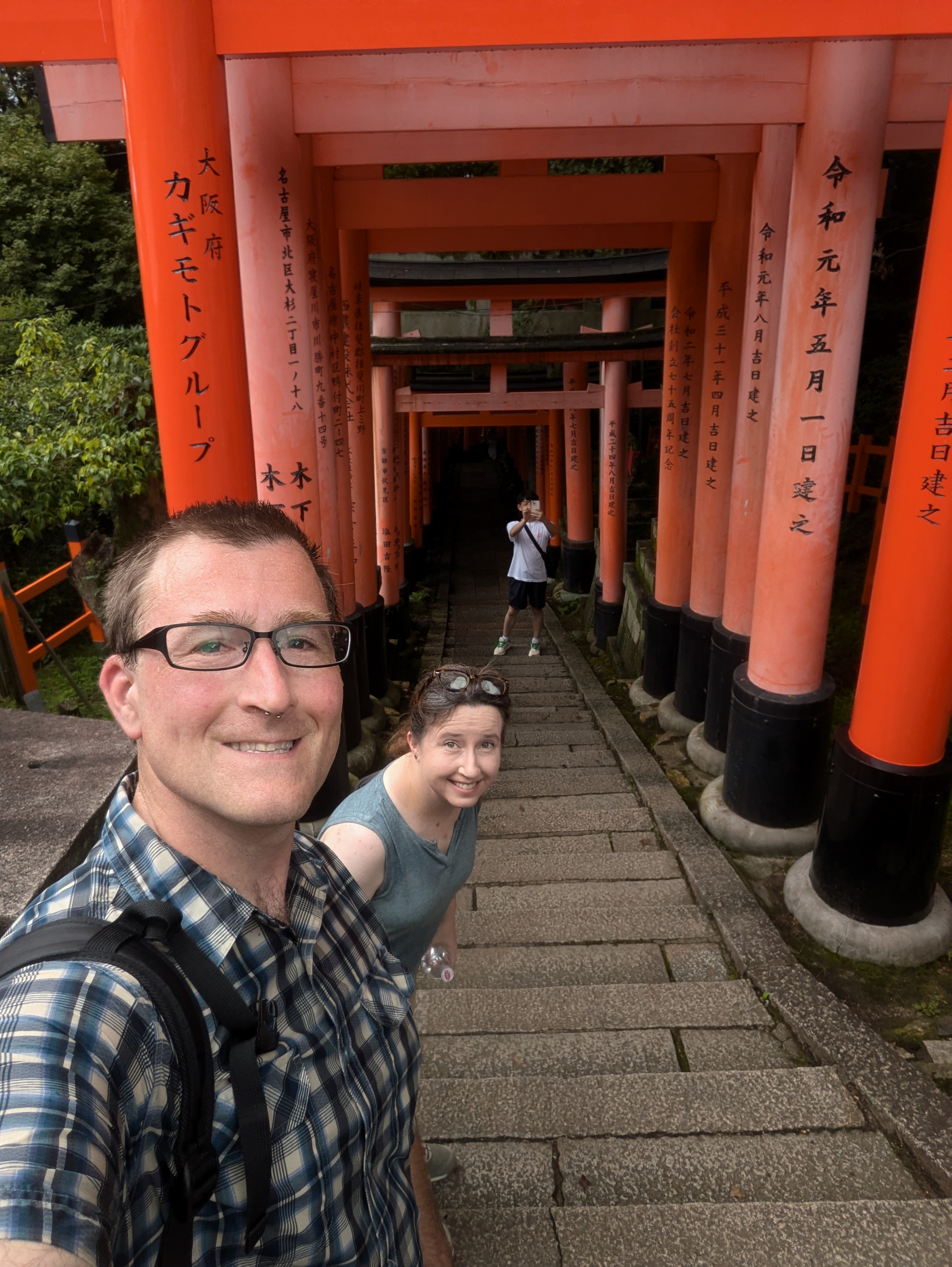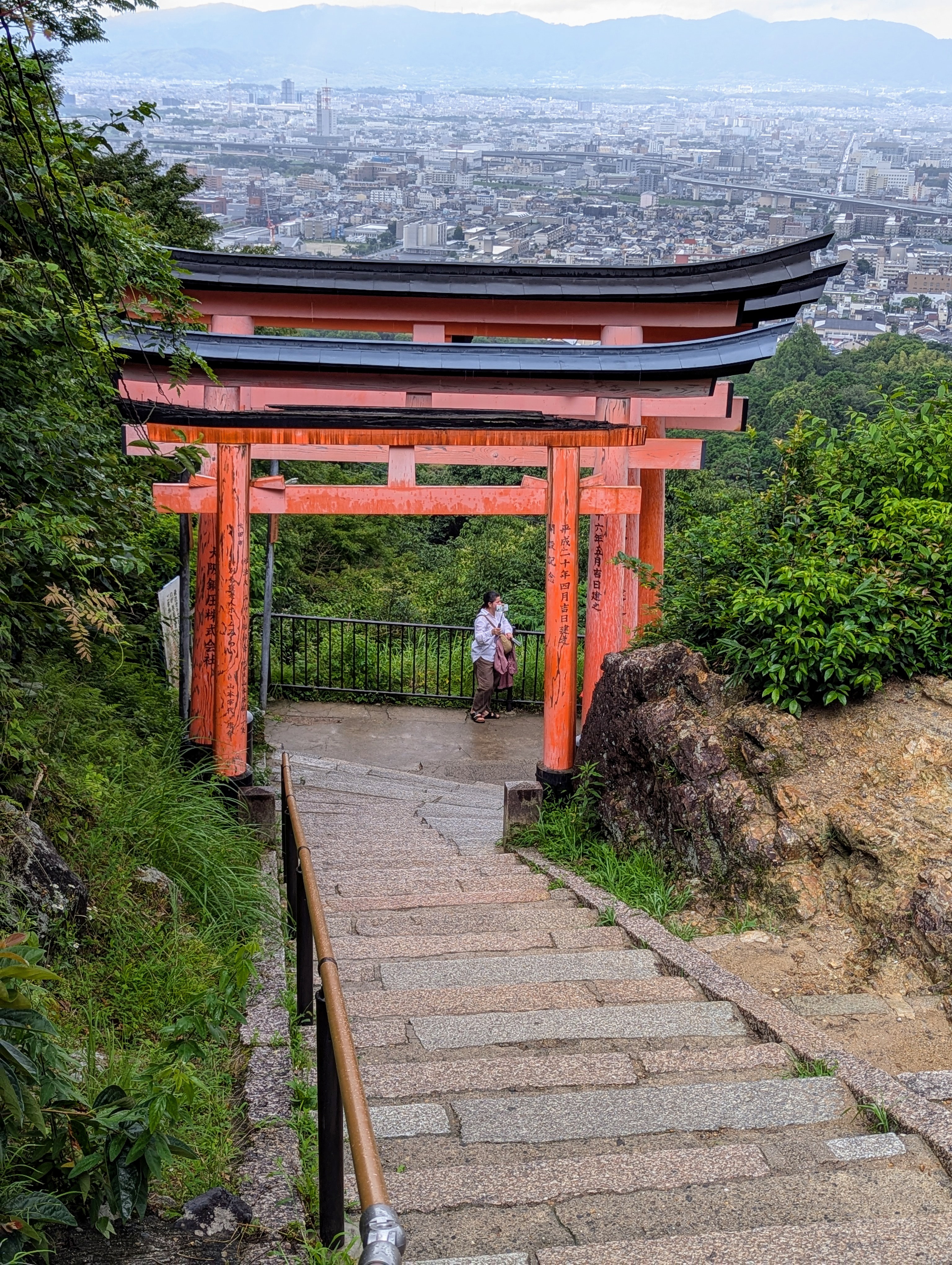 I was done with mosquitos so we decided to take the main pathway back down the mountain. The majority of the tourists had subsided and along the way we got a great view over Kyoto. When you go down you can see the names of the torii donors etched on the backsides of the gates. And you can look backwards and be thankful you’re not going uphill anymore.