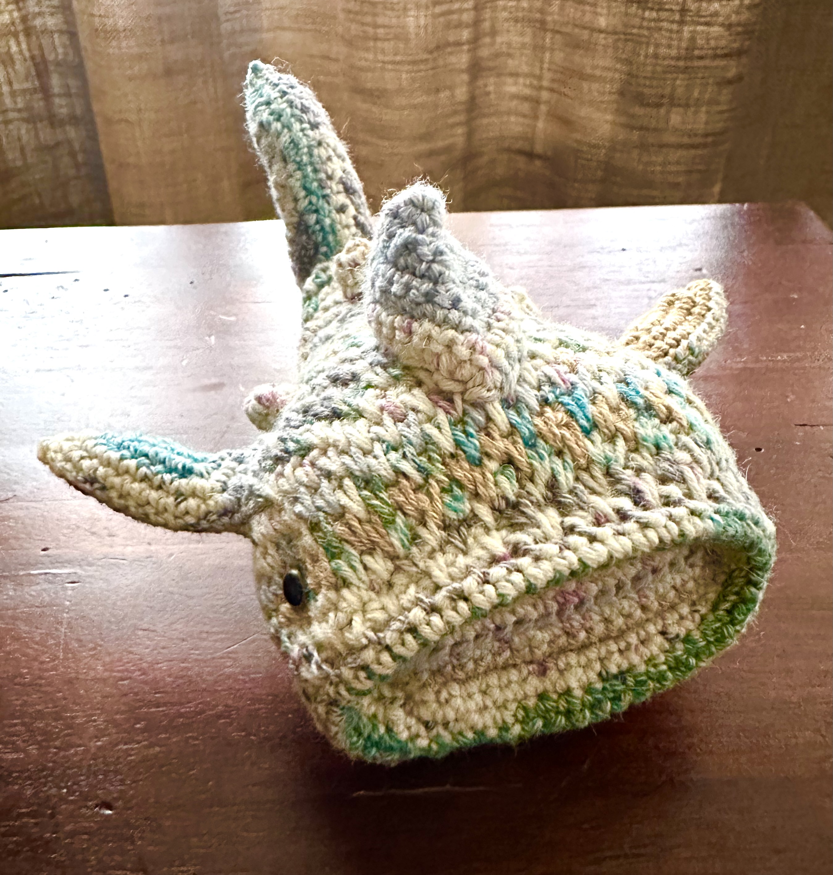The other somewhat dummy thing I did is I didn’t bother to notice that the whale shark’s mouth in the instruction booklet photo is white, and just ended up doing the whole thing in the variegated yarn.